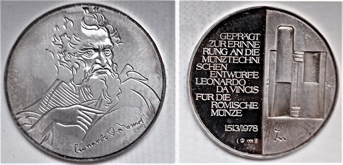 Die von dem in Berlin und Meersburg am Bodensee tätige Gold- und Silberschmied sowie Medailleur Harry Maximilian Buchberger 1978 geschaffene Silbermedaille bildet Leonardo da Vinci nach einem Selbstporträt und dessen Zeichnung für eine in der päpstlichen Münze in Rom konstruierte Prägebüchse in geöffnetem Zustand ab.