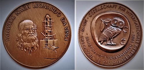 Harry Maximilian Buchberger schuf für die Gesellschaft für Internationale Geldgeschichte Frankfurt am Main (GIG) eine Medaillenserie mit Bildern von Frankfurter Münzen und dem Grundriss der Münzstätte. Die Ausgabe von 1989 bildet Leonardo und sein Fallwerk ab und zeigt das GIG-Logo.