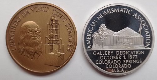 Die Medaille der American Numismatic Association von 1977 verbindet Leonardos Bildnis und seinen Fallhammer mit der Ansicht des Money Museum in Colorado Springs.