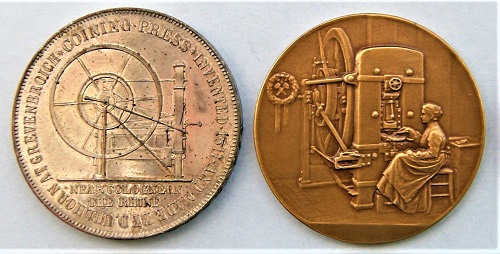 Die Medaille der Firma Uhlhorn in Grevenbroich am Rhein von 1851 wurde zur Weltausstellung in London geprägt, daneben bedient eine Frau auf der um 1900 geprägten Wiener Medaille eine Kniehebelpresse. Die von Franz Krischker gestaltete Plakette schildert Arbeitsabläufe in der Preußischen Staatsmünze in den 1930er Jahren.