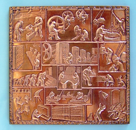 Die von Franz Krischker geschaffene Plakette aus Kupfer schildert Arbeitsabläufe in der Preußischen Staatsmünze in Berlin während der 1930er Jahre.