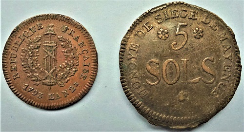 Bei der Belagerung und Beschießung durch preußische Truppen erlitten Mainz und seine Einwohner große Schäden und Verluste. Außerdem ging in der eingeschlossenen Stadt das Geld aus, weshalb man Ersatz schaffen musste. Als Material stand nur eine sehr spröde und schwer zu prägende Mischung aus Kupfer, Messing und Bronze zur Verfügung, die vor allem aus eingeschmolzenen Kirchenglocken bestand. Die in Mainz und an anderen Orten in ähnlicher Situation hergestellten Belagerungsmünzen und Ersatzgeldscheine werden gelegentlich vom Münzhandel angeboten. Zum Unterhalt und zur Bezahlung eingeschlossener Soldaten sowie zur Begleichung weiterer Kosten bestimmt, wirft solches Notgeld ein bemerkenswertes Schlaglicht auf die sozialen und ökonomischen Zustände in Festungen und Städten, die von der Außenwelt abgeschnitten waren, und sie zeigen, wie man die prekären Verhältnisse dort meisterte.