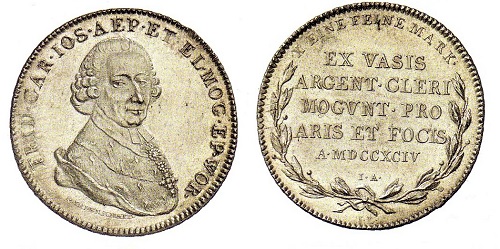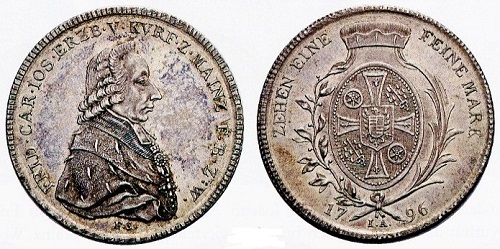 Die Stempel für die Taler von 1795 auf die Befreiung der von französischen Truppen belagerten Stadt Mainz wurden von Johann Jakob Stieler geschnitten. Von dem mit dem Namen des Oberbefehlshabers der österreichischen und Reichsarmee versehenen Taler existieren nur wenige Exemplare.