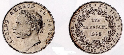Ferdinand Korn hat Stempel auch für die in Wiesbaden geprägten Münzen der Herzöge zu Nassau geschnitten.