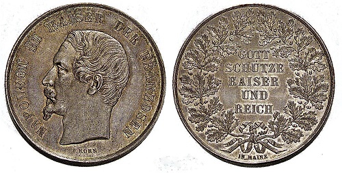 Eckhart Pick nutzt die Gelegenheit, um mit Legenden rund um eine Medaille mit dem Kopf des 1852 französischen Kaisers Napoleon III. und der Widmung im Eichenkranz GOTT SCHÜTZE KAISER UND REICH aufzuräumen. Die mit F. KORN beziehungsweise IN MAINZ signierte Medaille trug ihrem Schöpfer den Verdacht ein, ein Vaterlandsverräter und Franzosenfreund zu sein. Über sie heißt es in dem bekannten Katalog von Paul Joseph und Eduard Fellner von 1896 über die Münzen und Medaillen von Frankfurt am Main, sie sei in der Freien Stadt im Auftrag des Mainzer Stempelschneiders Korn geprägt worden. Eckhart Pick kann nach einem Blick ins Frankfurter Stadtarchiv nun sagen sagen, dass die Medaille 1852 geprägt wurde, schon bald nach der Ausrufung Napoleons III. zum Kaiser. Sie dienten dem Hersteller als Referenz für seinen Versuch, vom französischen Hof mit einem Arbeitsauftrag bedacht zu werden. Dieser erfolgte nicht, wenigstens aber wurde Korns Mühe mit 300 Francs honoriert.