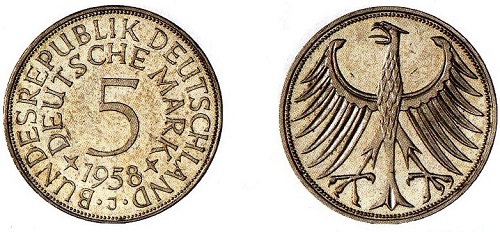In riesigen Mengen wurden ab 1951 aus mexikanischem Silber die neuen deutschen Fünfmarkmünzen geprägt. Selten ist das Hamburger Fünfmarkstück von 1958, erkennbar am Prägebuchstaben J.