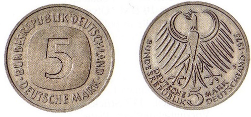 Steigende Silberpreise erzwangen die Ablösung des silbernen Fünfmarkstücks durch eine Ausgabe im Werkstoff Magnimat mit neuer Wert- und Adlerseite. Alternativvorschläge für die 1975 eingeführte Kursmünze existieren nur als Probeabschläge.