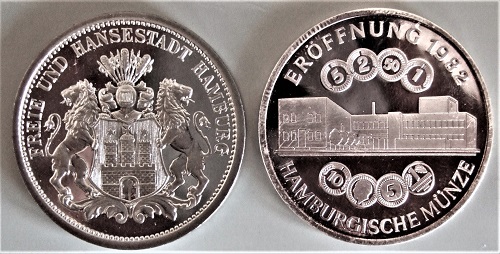 Kurs- und Gedenkmünzen der Bundesrepublik Deutschland wurden in Hamburg, Karlsruhe, München und Stuttgart hergestellt, nach der Wiedervereinigung 1990 kam Berlin hinzu. Hier Medaillen, mit denen die Hamburger und die Karlsruher Münze für sich Werbung machten.