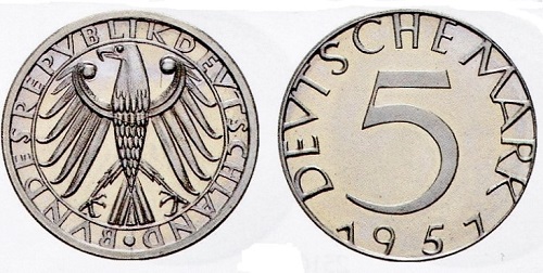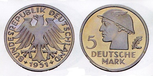 Das ist kurz gefasst die Vorgeschichte des bundesdeutschen Fünfmarkstücks, das von 1951 bis 2001 in zwei unterschiedlichen Metallen, vielen Versionen und riesigen Mengen hergestellt wurde. Die 1951 begonnene Ausgabe von Silbergeld im Wert von fünf DM wurde von den Bundesbürgern als ein Stück Normalität in den wirtschaftlichen und politischen Verhältnissen nach den schrecklichen Verlusten und Verheerungen durch die Nazidiktatur und den Zweiten Weltkrieg begrüßt und als Bestätigung der vom Wirtschaftsminister Ludwig Erhard ausgegebenen Parole "Wohlstand für alle" gewertet.