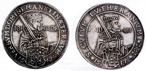Bevor Kurfürst Friedrich August I., bekannt als August der Starke, im Jahre 1697 die polnische Königskrone bekam, trat er zur katholischen Kirche über, was im Ursprungsland des Protestantismus zu Unmut und Bestürzung führte. "Augustus Rex" tolerierte allerdings Luthers Lehre, um innenpolitische Unruhen zu vermeiden, baute aber in Dresden die prächtige katholische Hofkirche. Es sind zwar sächsische Gedenkprägungen von 1717 und 1730 zur Erinnerung an Luther und die Reformation bekannt, doch haben sie keinen offiziellen Charakter wie die Prägungen aus dem frühen 17. Jahrhundert mit den kurfürstlichen Bildnissen. Mit Eifer nahmen sich jedoch die in den kleinen sächsisch-thüringischen Herzogtümern und anderen protestantischen Herrschaften regierenden Herzöge des Themas an, so dass Sachsen-Sammler hier reiches Material finden. Darüber hinaus taten sich jeweils zu den Säkularfeiern andere protestantische Stände durch Erinnerungsprägungen hervor. Nachdem die Kurfürsten und - ab 1806 - Könige von Sachsen als Verteidiger der lutherischen Lehre ausfielen, übernahmen die Hohenzollern in Preußen die Führung in der protestantischen Bewegung und unterstrichen das auch durch aufwendige Prägungen.