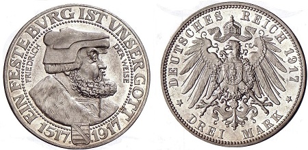 Erwähnt sei, dass 1917 die Idee verworfen wurde, Martin Luther anläßlich der Vierhundertjahrfeier der Reformation durch ein Dreimarkstück zu ehren. Da damals im Deutschen Reich nur Personen fürstlichen Geblüts beziehungsweise städtische Wappen auf Kurs- und Gedenkmünzen erscheinen durften, schnitt der Stempelschneider Friedrich Wilhelm Hörnlein einen Vorderseitenstempel mit dem Bildnis Friedrichs des Weisen, angelehnt an Medaillen des frühen 16. Jahrhunderts. Wie der Kenner der sächsischen Münzkunde, Walther Haupt, in seinem Buch "Sächsische Münzkunde" (Berlin 1978) berichtet, sei der als Motiv naheliegende Lutherkopf verworfen worden, weil damals nur Köpfe von Monarchen auf Reichsmünzen erscheinen durften. Vielleicht habe man auch dem katholischen Königshaus in Sachsen nicht zuviel zumuten wollen. Die Not des Krieges habe nur eine Auflage von einhundert Stück erlaubt. Davon habe Nagel dreißig Exemplare mit seinem Gehalt ausbezahlt bekommen. Die übrigen seien zurückgehalten worden. Infolge der Revolution von 1918 seien sie mit Ausnahme von ein paar wenigen Stücken, die "unrechtmäßig auf die Seite gebracht wurden" versehentlich wieder eingeschmolzen worden. Vielleicht werden Recherchen in alten Akten Licht in diese merkwürdige Geschichte bringen. Unbekannt ist, wieviel echte "Friedrich der Weise" noch existieren.