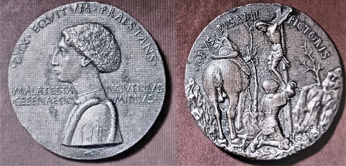 Eine der frühesten auf diese Art und Weise gefertigten Medaille galt dem byzantinischen Kaiser Johannes III. Paläologus. Er war 1438 nach Italien gekommen, um auf dem Konzil von Ferrara zu versuchen, die Kirchen des Ostens und des Westens zu vereinen, hatte damit aber keinen Erfolg. Zum Porträt des Kaisers mit langem Bart und spitzem Hut kontrastiert auf der Rückseite der Herrscher hoch zu Ross reitend und vor dem Kruzifix betend. Diese Form der Verehrung einer hohen Persönlichkeit war neu und wurde in der folgenden Zeit auf verschiedenste Weise adaptiert. Wer sich mit dem Thema Ross und Reiter auf Münzen und Medaillen befasst und nach entsprechenden Exemplaren sucht, wird viele Beispiele finden. Pisanello war mit seinen Medaillen so erfolgreich, dass er von vielen Potentaten seiner Zeit mit ihrer Schaffung beauftragt wurde.