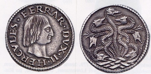 Kaiser Karl der Große ließ sich auf dem um 800 geschlagenen, äußerst seltenen Denar wie ein römischer Kaiser mit Lorbeerkranz und Herrschermantel darstellen. Sogar einfache Silbermünzen begann man im 15. Jahrhundert in Italien und bald auch in anderen Ländern mit lebenswahren Fürstenporträts zu schmücken. Dieser undatierte Testone mit dem Porträt des Ercole II. d’Este und der vielköpfigen Hydra stammt aus Ferrara.