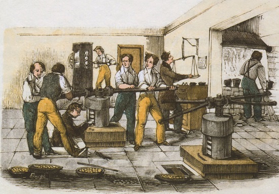 Die Grafik aus dem 19. Jahrhundert zeigt, wie man Münzen und Medaillen noch in mühsamer Handarbeit Stück für Stücke auf der Spindelpresse hergestellt hat.(Fotos/Repros: Caspar, Münzkabinett Berlin)