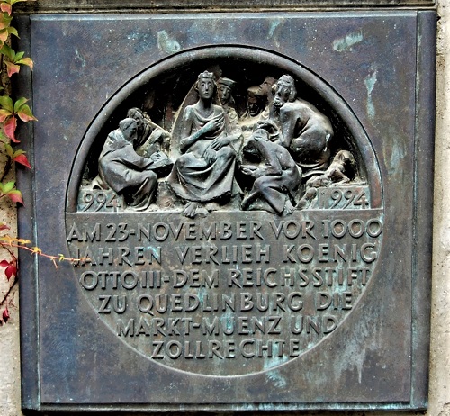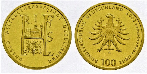Die seit 1994 auf der Unesco-Liste des Weltkulturerbes stehende Fachwerkstadt Quedlinburg wurde 2003 durch eine Gedenkmünze zu 100 Euro zu ehren. Mit ihr eröffnete die Bundesrepublik Deutschland eine Serie von Goldmünzen, die ausgewählten Orten des Weltkulturerbes gewidmet ist. Die Bildseite erinnert an die Entstehung der mit über tausend Fachwerkbauten bestückten Stadt und kombiniert Elemente eines Siegels von König Heinrich I. mit einer Ansicht der mittelalterlichen Stiftskirche. Der Schriftblock darunter erwähnt herausragende sakrale Baudenkmäler den Schlossberg mit dem ehemaligen Damenstift und der Stiftkirche St. Servatius. Diese Miniatur wird eingerahmt von Buchstaben aus einem Siegel, das der aus sächsischem Herzogsgeschlecht stammende König Heinrich I. der Vogler (reg. 919-936) führte. Er machte die "Villa quake dicitur Quitilingaburg", so die erste urkundliche Erwähnung von 922, zu einem Zentrum des damaligen deutschen Reichs. Zahlreiche Besuche deutscher Könige und Kaiser im 10. bis 13. Jahrhundert in Quedlinburg, aber auch der Bau von Kirchen und Klöstern belegen die herausragende Stellung der Stadt als politisches und geistliches Zentrum im hohen Mittelalter.