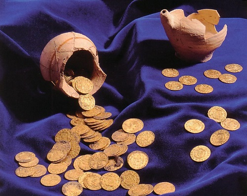Münzschätze gehören in die Hand der Archäologen und Numismatiker, sie privat einzubehalten und gar stückweise zu vermarkten ist verboten. Dieser Goldschatz kam samt Tontopf 2005 in Regensburg an Tageslicht.