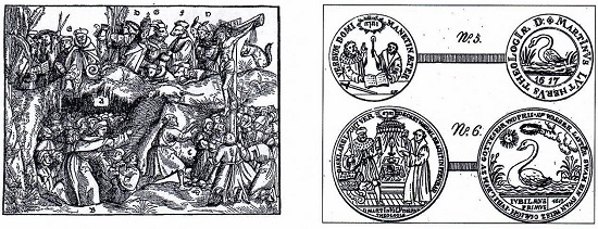 Die Widersacher der Lutherschen Lehre nutzten wie ihre Befürworter neben Stichen und Flugblättern auch Münzen und Medaillen als Medium, um Propaganda für ihre Ziele zu machen und die andere Seite zu verteufeln. Die Methoden in beiden Lagern waren, überblickt man das Material, alles andere als fein. Man findet in Publikationen über Luther und seine Zeit sowie Katalogen zum Thema "Spottmünzen" auch bemerkenswerte Zeugnisse der Propaganda zugunsten des Wittenberger Reformators beziehungsweise von der katholischen Kirche befeuerten Gegenreformation. Als im Jahre 1617 in verschiedenen protestantischen Fürstentümern und Städten des Thesenanschlags einhundert Jahre zuvor gedacht wurde, verfiel die Stadt Magdeburg auf die Idee, zwei Reformatoren - Jan Hus und Martin Luther - auf ein und derselben Münze darzustellen. Das ist einmalig in der Münzgeschichte. Der böhmische geistliche Hus und sein Wittenberger Amtsbruder Luther sind, angetan mit pelzverbrämten Mänteln und jeder eine Bibel haltend, auf der Vorderseite des von Münzmeister Heinrich Meier geprägten Talers dargestellt. Einzelheiten nennt Friedrich von Schrötter in der "Beschreibung der neuzeitlichen Münzen des Erzstifts und der Stadt Magdeburg 1400-1682" (Magdeburg 1909). Die in zwei Zeilen umlaufende Legende zitiert eine angebliche Äußerung von Jan Hus über das Fortwirken seiner Lehre und nimmt Bezug auf die reformatorische Tätigkeit Luthers.