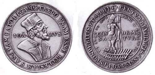 Auf dem Konstanzer Konzil widerstand Jan Hus der Forderung, seinen Ideen abzuschwören. Als Abschreckung für seine Anhänger wurde er am 6. Juli 1415 in der Bischofsstadt am Bodensee öffentlich als Ketzer verbrannt. Die Nachricht vom gewaltsamen Tod ihres Wortführers, dem freies Geleit nach Konstanz zugesichert worden war, löste in Böhmen große Empörung aus. Der Märtyre wurde zum Namensgeber einer militanten Bewegung, die kirchenreformatorische, antifeudale, national-tschechische Ziele verfolgte und große Wirkungen in ganz Europa hatte. Die Hussiten lehrten die damaligen Machthaber durch Überfälle und Brandschatzungen das Fürchten. Die stark abgekürzte zweizeilige Inschrift in lateinischer Sprache auf dem Magdeburger Taler lautet übersetzt: "Nachdem einhundert Jahre vergangen sind, werdet ihr Gott und mir, dem 1415 verbrannten Jan Hus, Recht geben. Nach Ablauf dieser Zeit wurde Doktor Martin Luther zur Wiederherstellung der himmlischen Lehre von Gott im Jahre 1517 berufen". Der "Zeitplan" wurde fast eingehalten. 1521 gewährte der sächsische Kurfürst Friedrich der Weise dem mit päpstlichem Bann und kaiserlicher Acht belegten Luther auf der Wartburg bei Eisenach Zuflucht, wo er unter dem Namen "Junker Jörg" das Neue Testament ins Deutsche übersetzte.