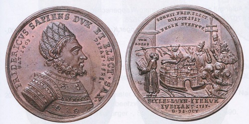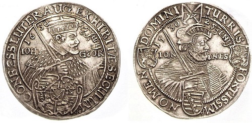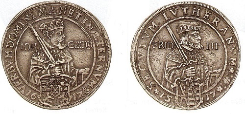 Namentlich Kursachsen, die Wiege und mit seiner Residenz- und Universitätsstadt Wittenberg Ausgangspunkt der Lutherschen Reformation, tat sich vor allem in den Jahren 1617 und 1630 durch Gedenktaler und andere Münzen sowie Medaillen hervor, die die Glaubensstärke des Herrscherhauses unterstreichen sollten. So findet man auf Gold- und Silbermünzen von 1617 Brustbilder des Kurfürsten Friedrich des Weisen, der schützend seine Hand über Luther hielt, und seines Nachfahren Johann Georg I. Außerdem gibt es Medaillen, auf denen Johann Georg I. und Martin Luther zusammen dargestellt sind, was zeitlich ein Unding ist, aber Kontinuität unterstreichen soll. Die Stücke sind unter anderem in dem von Julius und Albert Erbstein verfassten Katalog "Erörterungen auf dem Gebiete der sächsischen Münz- und Medaillen-Geschichte bei Verzeichnung der Hofrath Engelhardt`schen Sammlung" (Dresden 1888-1909, Reprint Leipzig 1976) zu finden. Sie sind frühe Beispiele für das Bestreben, historische Ereignisse auf Münzen und Medaillen zu verewigen. Zur Einhundertjahrfeier der Augsburger Konfession 1630, mitten im Dreißigjährigen Krieg, kamen wiederum Gedenkmünzen mit dem Brustbild der beiden sächsischen Kurfürsten heraus. Das war in jener Zeit, als Johann Georg I. dem in Norddeutschland eingefallenen Schwedenkönig Gustav Adolf, der sich als Verteidiger der lutherischen Lehre verstand, zu imponieren trachtete. Der Kurfürst hat mehrfach die Seiten gewechselt und war zeitweilig auch mit dem Kaiser und der von ihm geführten katholischen Liga verbunden.