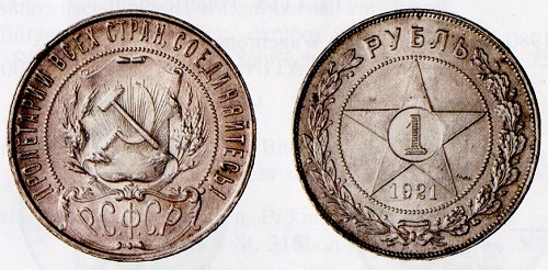 Wie im Deutschen Reich und im ehemaligen Vielvölkerstaat Österreich-Ungarn, so wurden auch in Sowjetrussland nach dem Ende der Monarchie neue Bilder und Symbole auf Münzen gesucht. Köpfe, Wappen und Symbole der überwundenen Zeit hatten ausgedient. Die Darstellungen auf den ab 1921 geprägten Werten zwischen einem Rubel und zehn Kopeken unterschieden sich fundamental von denen, die man bisher in der Hand hatte. Das neue, aus Hammer und Sichel bestehende Sowjetwappen symbolisierte die Einheit von Arbeiterklasse und Bauernschaft, wie man damals sagte. Die Zahlen im fünfzackigen Stern auf den Rubel- und Fünfzig-Kopeken-Stücken geben den jeweiligen Wert an. Die ins Deutsche übersetzte Umschrift "Proletarier aller Länder, vereinigt euch" ist ein Zitat aus dem Kommunistischen Manifest von Marx und Engels aus dem Jahr 1848.