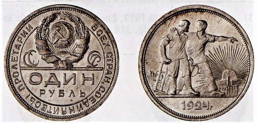 Das 1924 veränderte Münzdesign berücksichtigte die Tatsache, dass sich Sowjetrussland zur Union der sozialistischen Sowjetrepubliken gewandelt hatte. Das geschah nicht auf friedlichem Weg, sondern durch Okkupation benachbarter Länder und gegen den Willen ihrer Bewohner. Auf Rubeln sieht man einen Bauern und einen Arbeiter vor der aufgehenden Sonne, und auf den Halbrubelstücken ist ein Schmied bei der Arbeit. Kombiniert sind diese symbolträchtigen Bilder mit dem neuen Sowjetwappen. Es besteht aus einem Hammer und einer Sichel auf dem Globus, über dem der fünfzackige Sowjetstern schwebt. Das von einem Ährenkranz umgebene Bild will sagen, dass eines Tages über der ganzen Welt die Sonne des Sozialismus und Kommunismus aufgehen wird. Ab 1924 kamen zu den Rubel- und Halbrubelstücken Kupfermünzen in Werten von fünf, drei, zwei und einer Kopeke. Sammler werden einige Mühe haben, diese und die anderen Münzen aus Sowjetzeiten zu bekommen. Vor allem die Kursmünzen kommen meist abgegriffen vor, weshalb exzellente Erhaltungen gut bezahlt werden. Der Münzhandel bietet regelmäßig auch Münzen dieser Periode sowie die der Nachfolgestaaten der 1991 im Orkus der Geschichte verschwundenen Sowjetunion an.