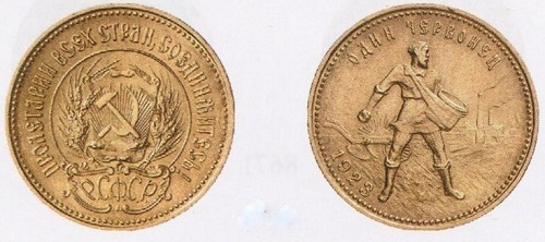 Zu den silbernen Rubel- und Kopekenwerten traten 1923 Goldmünzen im Wert von zehn Rubeln. Die so genannten Tscherwonzen mit dem symbolträchtigen Bild eines säenden Bauern mit einer Fabriklandschaft im Hintergrund wurden nur kurze Zeit vor allem zur Bezahlung von Rechnungen im Ausland hergestellt. In späten Sowjetzeiten hat man die seltenen Goldstücke mit neuen Jahreszahlen nachgeprägt.