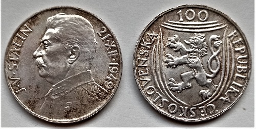 Da die DDR erst ab 1966 Gedenkmünzen herausgab, konnte sie 1949 den 70. Geburtstag des lange als Befreier vom Faschismus und ideologischen Leitstern gefeierten Josef Stalin nicht mit einer Sonderprägung ehren. Das tat die von Stalinisten beherrschte Tschechoslowakische Republik mit einer silbernen Gedenkmünze im Wert von 100 Kronen. Dargestellt auf diesem numismatischen Kotau ist Stalin in Militäruniform, wie man es aus feudalen Zeiten bei Bildnissen von Kaisern und Königen kannte. Die in Prag sitzende Partei- und Staatsführung bekundete mit dieser Ausgabe ihre besondere Hörigkeit gegenüber ihrem in Moskau herrschenden Befehlsgeber.