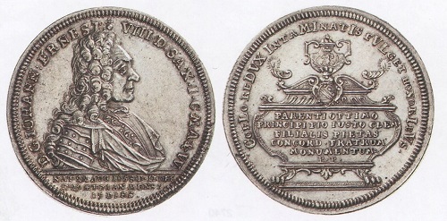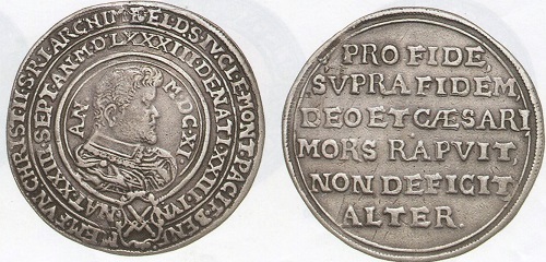 Selbstverständlich beließ man es nicht bei Leichenfeiern und kostbar dekorierten Grabmälern, sondern sorgte auch mit silbernen und goldenen Ehrengedächtnissen in Form von Münzen und Medaillen für numismatischen Nachruhm. Der Brauch, das Ableben gekrönter Häupter durch solche Prägungen den Zeitgenossen und der Nachwelt mitzuteilen, lässt sich bis in das 16. Jahrhundert zurückverfolgen. Dadurch war es möglich, auch dann die Erinnerung an eine Person wachzuhalten, wenn deren Gebeine schon längst zu Staub zerfallen sind. Hierfür boten sich vor allem die großformatigen Taler an, die seit dem ausgehenden 15. Jahrhundert überall in wachsender Zahl geprägt und auch als Mittel fürstlicher Propaganda genutzt wurden.