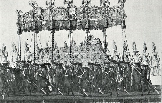 Bei fürstlichen Trauerfeiern wurde in Kurbrandenburg und Preußen – hier die Prozession mit dem 1713 verstorbenen König Friedrich I. - und nicht nur dort, großer Aufwand getrieben.