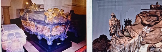 Kostbar dekorierte Sarkophage stehen in der Hohenzollerngruft des Berliner Doms, die aktuell saniert und neu gestaltet wird, und in der Wiener Kapuzinergruft, in der zahlreiche Mitglieder der Habsburgerfamilie bestattet sind. Die Fotos links zeigen den Sarg des 1711 verstorbenen Markgrafen Philipp Wilhelm von Brandenburg-Schwedt und rechts einen gekrönten Totenschädel vom Sarg Kaiser Karls VI.