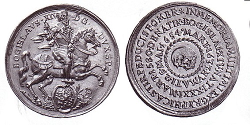 Mit einem Reiterbildnis und Totenkopf geschmückt ist die Goldmedaille von 1654 im Gewicht von zehn Dukaten auf die Beisetzung des pommerschen Herzogs Bogilaus XIV.