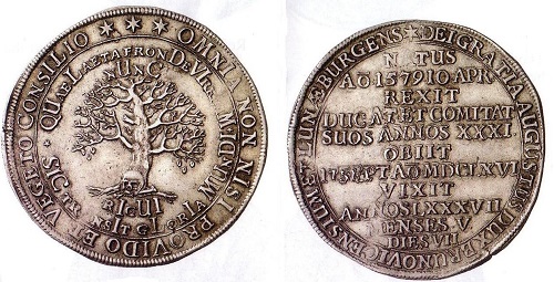 Der Gothaer Herzog Ernst der Fromme, der sich mit einer Reihe selbst entworfener Katechismus-, Glaubens- und anderer Taler ein numismatisches Denkmal gesetzt hat, fasste auf einem Taler zu seinem Ableben diese Gewissheit so zusammen: „Nun bin ich frey von sünd und pein / Gesund mein leib die seele rein / Nun schau ich Gott von angesicht / In seinem haus mit vollem licht / Nun feyr ich mit der heilgen schaar / das ewig seelge Jubel Jahr“. Wie Bäume ihr Laub abwerfen, wenn der Winter naht, so ist es auch dem Menschen anzuraten, am Abend seines Lebens von allem Ballast zu lassen. Diese Botschaft vermittelt eine Serie von Sterbemünzen zum Tod des Herzogs Augusts des Jüngeren von Braunschweig-Wolfenbüttel, dem wir die nach ihm benannte Bibliothek in Wolfenbüttel, einst Arbeitsstätte von Leibniz und Lessing, aber auch zahlreiche interessante Silbermünzen, darunter die berühmten Glockentaler, verdanken. Die Jahreszahl 1666 ist als Chronogramm in der Schrift um den entlaubten Baum versteckt, an dessen Wurzeln ein Totenkopf als Sinnbild für das Unumkehrbare liegt. Von diesem Sterbetaler kommen sowohl Mehrfachtaler als auch einfache Ausgaben vor.