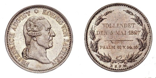 Der schmucklose Sterbetaler von König Friedrich August von Sachsen, der ungewöhnlich lange von 1763 bis 1827 regierte, weist auf den Psalm 91 Vers 14-15 hin: „Gott sagt: ,Er liebt mich von ganzem Herzen, darum will ich ihn retten. Ich werde ihn schützen, weil er mich kennt und ehrt. Wenn er zu mir ruft, erhöre ich ihn. Wenn er keinen Ausweg mehr weiß, bin ich bei ihm. Ich will ihn befreien und zu Ehren bringen.'“ (Fotos/Repros: Caspar)