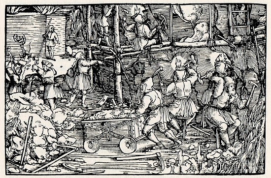 Der namentlich nicht bekannte Petrarcameister schildert auf dem Holzschnitt im Augsburger Trostspiegel von 1532 die mit viel Kraftanstrengung verbundene "Fyndung der Goldgruben".