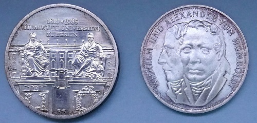 Wilhelm und Alexander von Humboldt auf Münzen der DDR von 1985 und 1967. Obwohl sie hohe Auflagen erlebten, sind die russischen Platinmünzen wegen massenhafter Einschmelzungen im 19. Jahrhundert heute selten und teuer. (Fotos/Repros: Caspar)