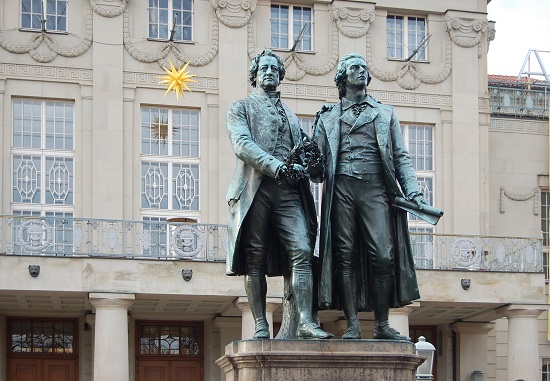 Das Goethe-Schiller-Denkmal vor dem Weimarer Nationaltheater wurde 1852 bis 1857 von Ernst Rietschel geschaffen. Der Dichter schwebt auf der 1832 zu seinem Tod von Anton Friedrich König geschaffenen Medaille auf einem Schwan in den Olymp.