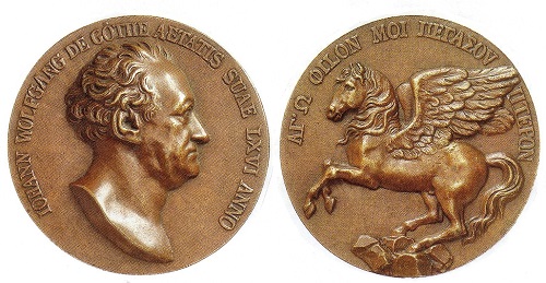 Johann Wolfgang von Goethe, hier abgebildet auf einer 1816 von Johann Gottfried Schadow "nach dem Leben" geschaffenen Medaille, wurde durch Münzen und Medaillen zu belehrenden Betrachtungen angeregt.