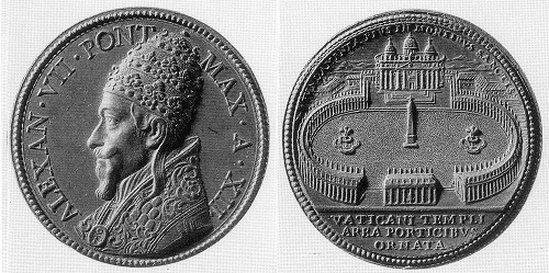 Bei seiner Italienreise 1786 bis 1788, die ihn aus einer Lebenskrise rettete, lernte Goethe auch Rom und seine Sehenswürdigkeiten kennen. Die mit Bastionen umgebene Engelsburg und die Peterskirche mit den Kolonnaden davor sind auf den Medaillen der Päpste Pius IV. und Alexander VII. aus dem 16. und 17. Jahrhundert präzise abgebildet. Wenn er diese und andere Prägungen in Weimar in die Hand nahm, konnte er sich Rom, der Hauptstadt der Welt, wie er im Rückblick schrieb, nahe fühlen.