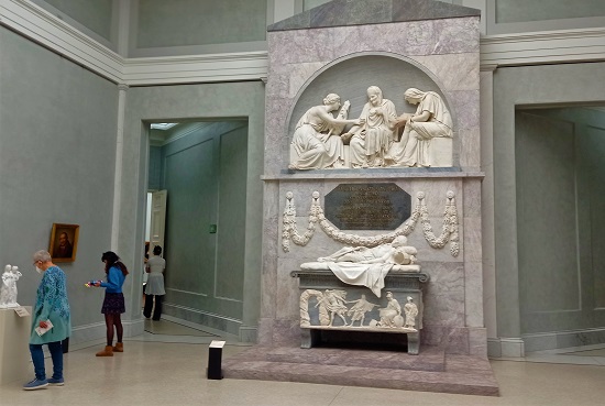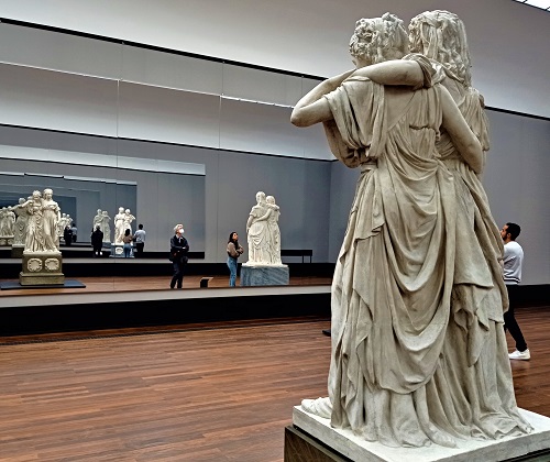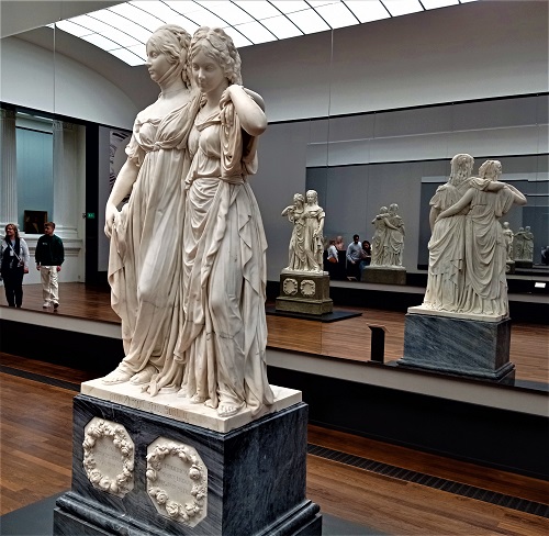 In elf Themenräumen stellt die Alte Nationalgalerie der Staatlichen Museen Preußischer Kulturbesitz die bildhauerischen und grafischen Hauptwerke des !1788 mit erst 24 Jahren zum Hofbildhauer ernannten Ausnahmekünstlers vor und schöpft dabei aus den eigenen Beständen, zeigt aber auch Skulpturen und Grafiken internationaler und nationaler Leihgeber. So bietet die Ausstellung Einblicke in das Leben des Künstlers und seiner Familie und macht mit seinen Freunden und Schülern bekannt. Im Mittelpunkt steht die Entstehungsgeschichte der berühmten Prinzessinnengruppe, deren Gipsmodell von 1795 und die marmorne Ausführung von 1797 in einem mit Spiegeln an der Wand versehenen Saal man von allen Seiten betrachten kann,, was vom Meister auch beabsichtigt war. Ergänzend dazu sind das verkleinerte Doppelstandbild der mecklenburgischen Prinzessinnen Luise und Friederike zu sehen, die bis heute in der Königlichen Porzellanmanufaktur Berlin (KPM) aus vielen Einzelteilen gefertigt wird, sowie Entwurfszeichnungen, Modelle und Vorbilder für die damals ungewöhnliche Doppelstatue zu sehen. Die keineswegs hoheitsvolle Darstellung der Schwestern, von der eine 1797 Königin Luise von Preußen wurde, und die andere, Friederike, den preußischen Prinzen Friedrich heiratete, der schon 1796 starb, entsprach ganz und gar nicht den Vorstellungen des 1797 auf den preußischen Thron gelangten Königs Friedrich Wilhelm III., der einen bürgerlichen Lebensstil pflegte und sich lieber mit Akten befasste als mit Kunst. Er nannte die Ikone klassizistischer Bildhauerei nur „fatal“, also peinlich und unangenehm, und verbannte sie in einen abgelegenen und schlecht beleuchteten Raum des Berliner Schlosses. Aus diesem Exil hat man sie ein Jahrhundert später ans Tageslicht geholt und sofort als herausragendes Werk von Schadow gefeiert.