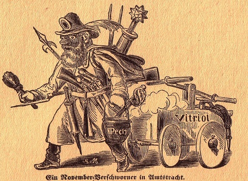 Der Revolution von 1848/49 Hungerkrawalle voran gegangen, die die um ihre Macht besorgten Fürsten blutig niederschlagen ließen. Sie hatten Angst vor einem gewaltsamen Umsturz, den bewaffnete Verschwörer herbei führen wollen. Die Karikatur nimmt den Fürsten-und Bürgerschreck drastisch aufs Korn.