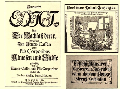 Was aus dem Nachlass von Menschen geschehen soll, die in den Genuss der Armenpflege kommen, und wem sie zufallen, hat Soldatenkönig Friedrich Wilhelm I. 1735 in einem Edikt geregelt. Um 1900 hat man kranke, obdachlose und arme Menschen mit mobilen Küchen versorgt, aber sie waren nur ein Tropfen auf dem heißen Stein. Überall hingen Verbotsschilder für Bettler, Hausierer und andere „unliebsame“ Leute an den Hauswänden.