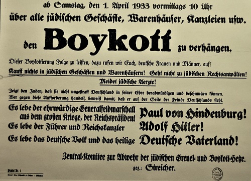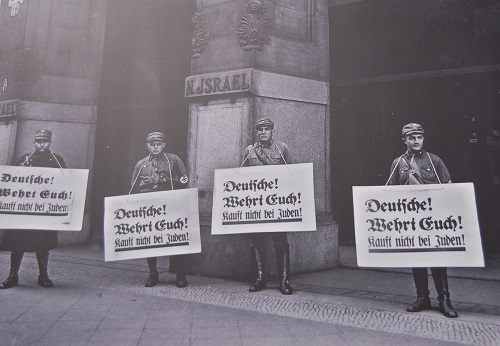 Von Propagandaminister Joseph Goebbels vorbereitet, fand am 1. April 1933, einem Sonnabend, eine Aktion unter dem Motto „Deutsche, wehrt euch, kauft nicht bei Juden“ statt. Offiziell begründet wurde sie mit der Forderung an das Ausland begründet, die Hetze gegen das neue Regime einzustellen. Goebbels ordnete in Übereinstimmung mit Hitler und der Regierung an, dass jüdische Warenhäuser, Läden und Waren sowie jüdische Ärzte und Rechtsanwälte boykottiert werden sollen, was nicht anderes bedeutete, als sie wirtschaftlich kaputt zu machen und als angeblich minderwertig aus der Volksgemeinschaft auszuschließen. Sprachlich wurde das durch den Gegensatz von Deutschen und Juden ausgedrückt. Die Vernichtung der jüdischen Warenhäuser hatte Hitler bereits in seinem Buch „Mein Kampf“ angekündigt.