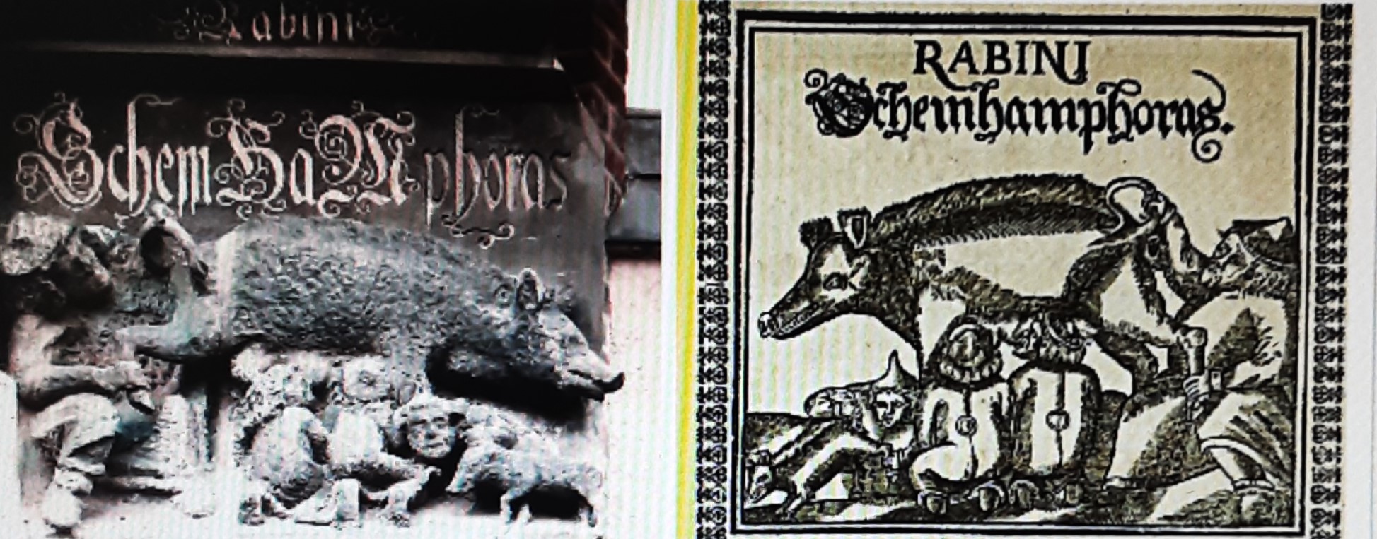 Ein Relief der „Judensau“ ist an der Fassade der Wittenberger Stadtkirche angebracht. Luther machte das Schandmal an seiner Predigtkirche in einer seiner Schriften weithin bekannt. In unseren Tagen wird kontrovers über das Relief diskutiert, das erklärende Tafel erhielt. Der Holzschnitt von 1595 zeigt, wie mit spitzen Hüten als Juden gekennzeichnete Menschen sich an dem Tier zu schaffen machen und sogar in seinen After schauen.