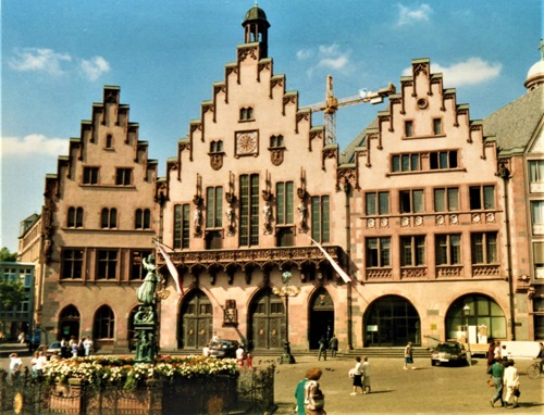 Das bei Kaiserwahlen und Krönungen für fürstliche Treffen und Bankette genutzte Rathaus wurde im Zweiten Weltkrieg bei einem Luftangriff fast vollständig zerstört. Hinter der historischen Fassade verbirgt sich ein Bürohaus im Stil der frühen 1950er Jahre. Der Gedenktaler von 1863 bildet den Frankfurter Römer mit dem Justizia-Brunnen und Kaiser Franz Joseph ab, der mit der Kalesche vorfährt, um am Fürstentag teilzunehmen.