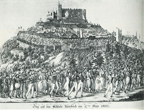 Beim Hambacher Fest im Sommer 1832 wurden zum erstenmal unmissverständlich Forderungen für die Überwindung der Fürstenherrschaft, Aufhebung der Zensur sowie Herstellung der deutschen Einheit erhoben. Die erste große politische Massendemonstration mit 30 000 Teilnehmern im Herrschaftsbereich des Königs von Bayern gab trotz geringer konkreter Ergebnisse der deutschen Einheits- und Freiheitsbewegung einen mächtigen Auftrieb.