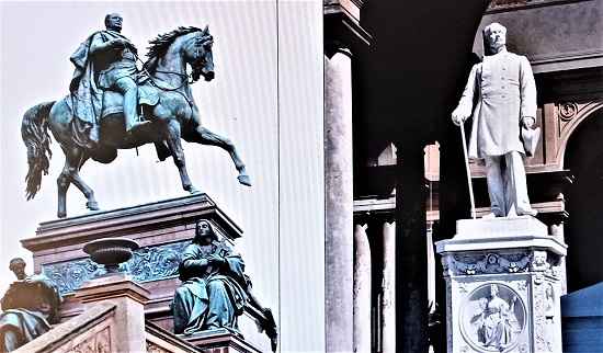 Friedrich Wilhelm IV. mal als stolzer Reiter auf der Freitreppe der Alten Nationalgalerie auf der Berliner Museumsinsel und mal als einfach gekleideter Bürgerkönig vor der Großen Orangerie im Park von Sanssouci. Andere Hohenzollerndenkmäler in der DDR wurden auf Befehl der SED in Berlin und Brandenburg bedenkenlos beseitigt.weil sie sich gegen die gottgewollte Ordnung erhoben hatten. Fotos/Repros: Caspar