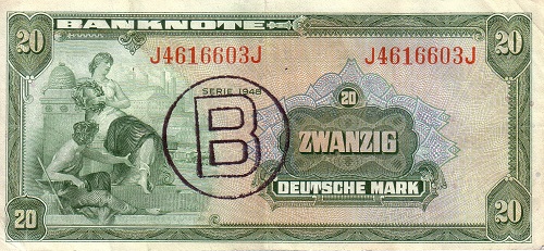 Die in West-Berlin umlaufenden neuen DM-Scheine erhielten ein großes B für Berlin aufgedruckt oder eine aus diesem Buchstaben gebildete Perforation. Die 1948 ausgegebenen Geldscheine wiesen noch keinen Herausgeber aus, sie waren auch vielfältigen Fälschungsversuchen ausgesetzt und fanden wegen künstlerischer Anleihen an US-amerikanische Vorbilder wenig Beifall. Deshalb war es nur eine Frage der Zeit, dass die am 1. März 1948 in Frankfurt am Main als Nachfolgerin der Reichsbank und als Vorläuferin der Deutschen Bundesbank gegründete Bank deutscher Länder eigene Noten drucken ließ. Um Fälschern das Handwerk zu legen und den Scheinen ein repräsentatives Aussehen zu geben, dienten den Gestaltern Porträts alter Meister als Vorlagen. Wie man schon in der Zeit der Weimarer Republik wusste, hat man bekannte Bildnisse ausgewählt, weil sie sich schwer nachahmen ließen, und so hat man bis zum Ende der Deutschen Mark im Jahr 2002 immer wieder Porträts auf den Geldscheinen abgebildet. Alle die frühen Banknoten und das Hartgeld der Bundesrepublik Deutschland werden regelmäßig vom Münzhandel angeboten. Manche Ausgaben sind selten und teuer, vor allem wenn es sie in tadellosem Zustand angeboten werden. Das gilt auch für bestimmte Geldscheine und Münzen der DDR.