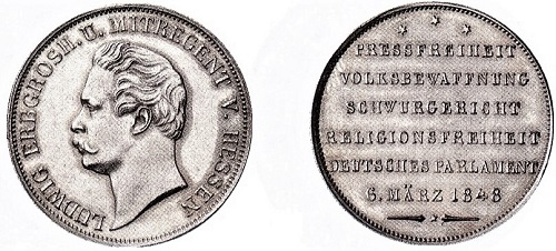 Um den mecklenburgischen Angsttaler von 1848 haben Geschäftemacher ein preissteigerndes Märchen gewoben. Der hessische Pressegulden stellt mit seinem Rückseitentext eine Ausnahme unter den Münzen und Medaillen vonn1848/49 dar.