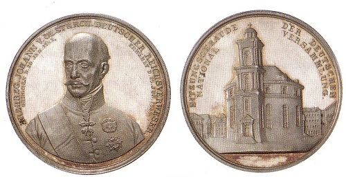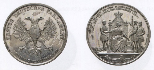 „Vereint, vereint ein deutsches Land, ein Volk, eine Sprache, ein deutsches Land“ lautet das Motto auf der Frankfurter Medaille. Sie ist Teil einer Serie von Münzen und Medaillen, die die deutsche Einheit fordert, die Arbeit der in der Frankfurter Paulskirche tagenden Nationalversammlung fördert und das Bild des 1848 zum Reichsverweser berufenen Erzherzogs Johann von Österreich in die Welt trägt.