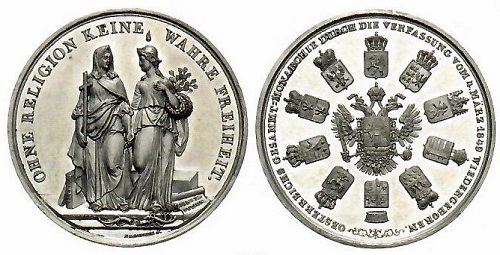 In den Jahren 1848/49 feierte die Konterrevolution überall in Europa Triumphe. „Ohne Religion keine Wahrheit“ verkündet die Medaille von 1849 auf die von Kaiser Franz Joseph seinen Staaten „oktroyierte“ Verfassung geprägt wurde. Indem sie „alles Konstitutionelle“ über Bord warf, konnte sich Kaiser Franz Joseph zum Alleinherrscher aufschwingen. (Fotos/Repros: Caspar)